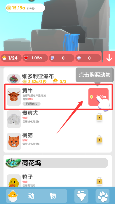 4、从可购置列表选取优质品种,例如黄牛,投入资金获取收益型动物。