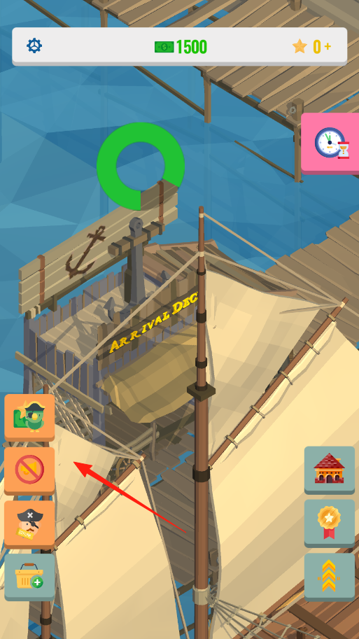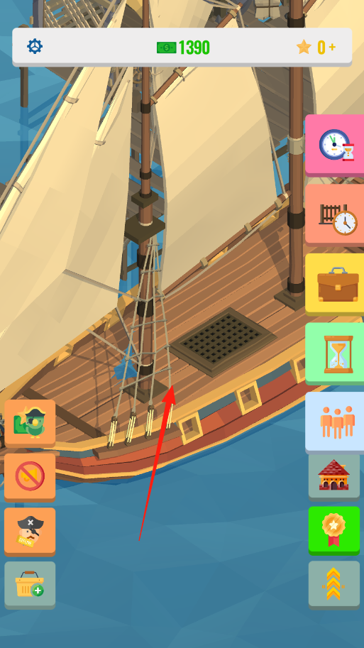 3、返回主船,点击箭头指向的甲板区域,放置或升级设施,优化海盗船布局,提升运营效率。