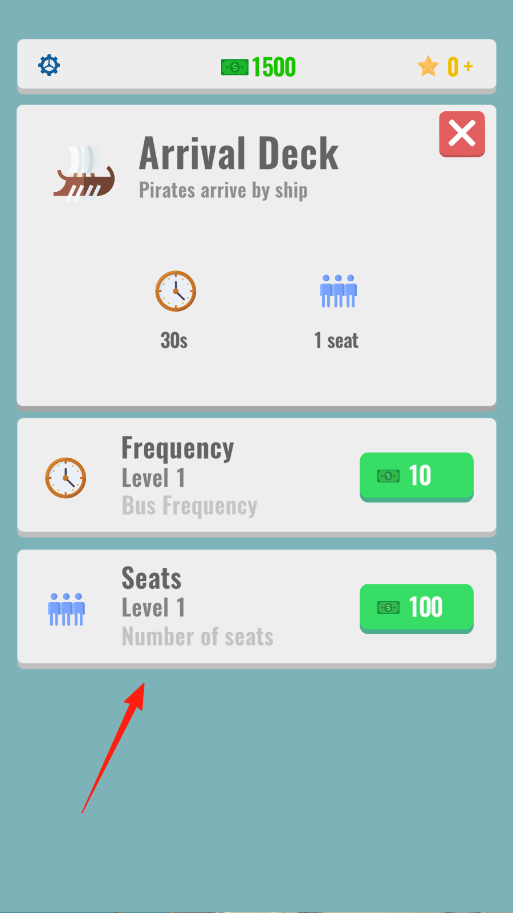2、在“ArrivalDeck”界面,选“Seats”(箭头指向),花费100金币升级,增加海盗座位数。