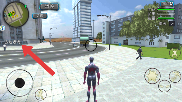 3、任务提示“去垃圾场”,还有生命、护甲、能量等状态显示,以及操作按钮、小地图、“暂停”按钮、“金币”显示等,呈现的是执行“去垃圾场”任务的场景。