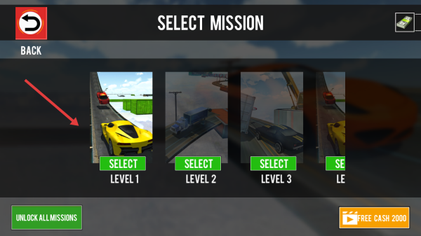2、在【SELECT MISSION】界面,选【LEVEL1】黄色跑车对应的任务,开启首场特技驾驶挑战。