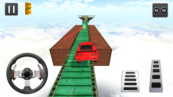 3、驾驶红色汽车时,沿绿色赛道前行,瞄准赛道上的目标点,利用方向盘和踏板操控,完成高空特技行驶。