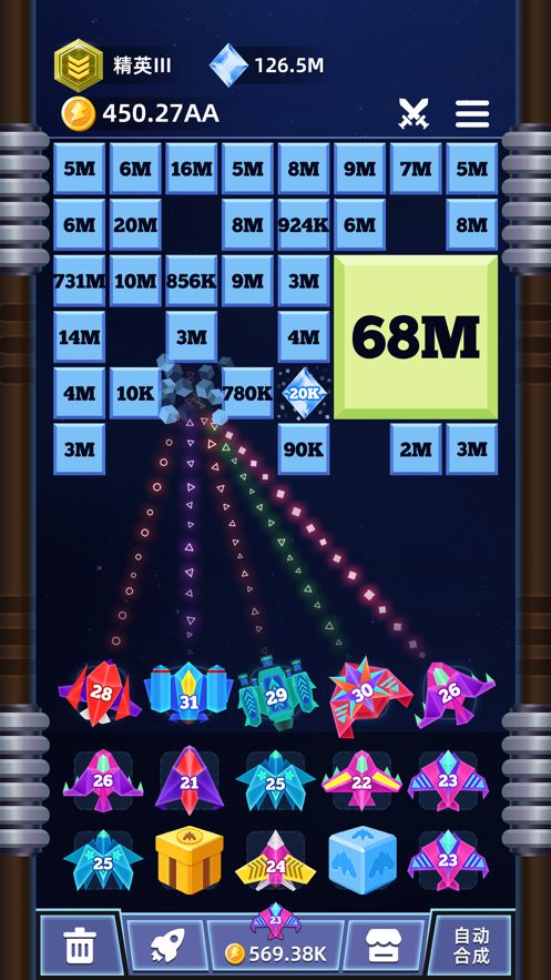 1、创新的方块增殖机制为传统塔防带来全新挑战,数字标记系统直观展示方块强度,需要根据数字大小合理部署战机。