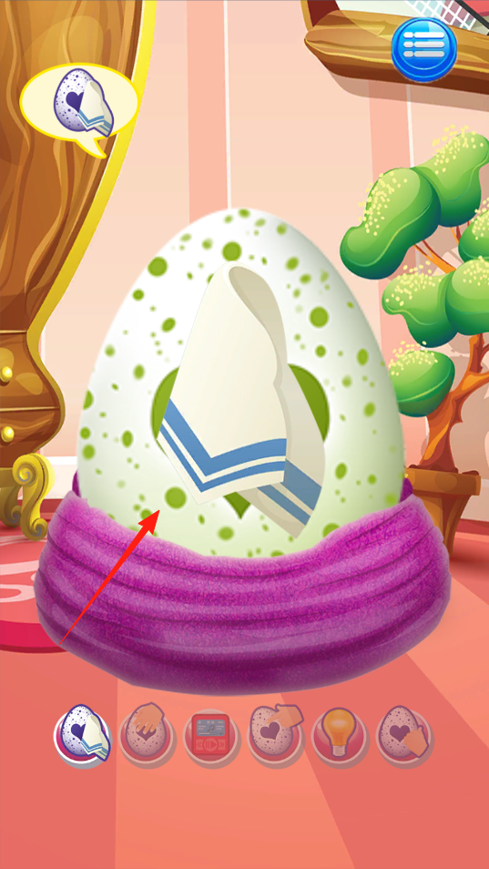 2、进入孵化场景,轻触蛋上的布,进行互动,借孵化互动机制,通过揭开遮挡,触发蛋的变化,逐步靠近新生物诞生,体验孵化过程的期待感与操作反馈。
