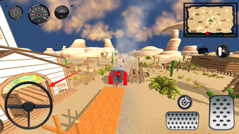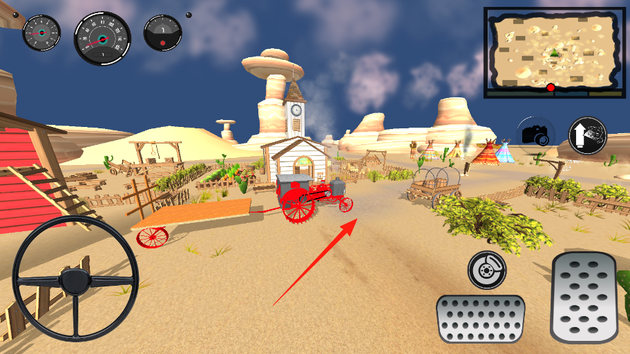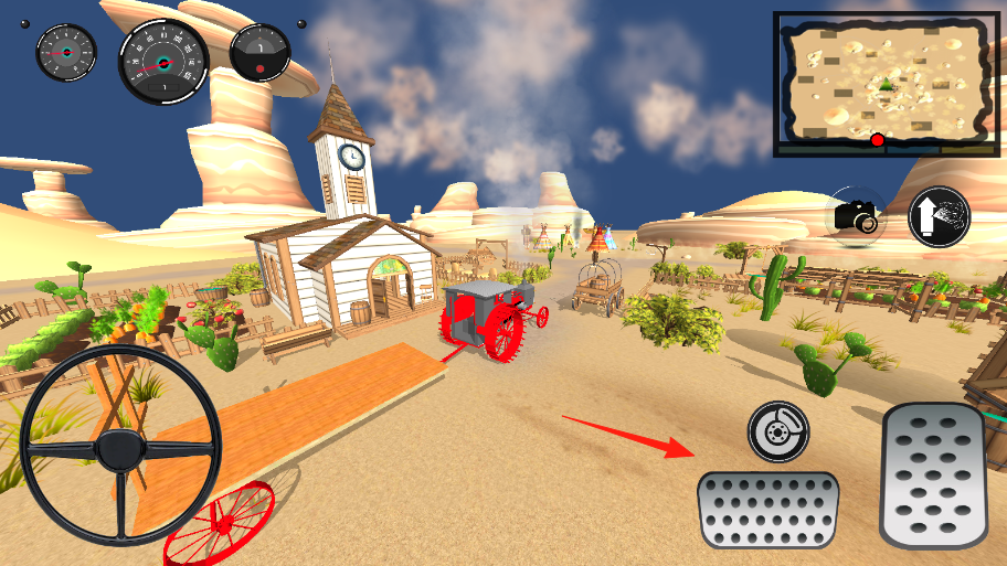 1、操控老式红色汽车(箭头指向),通过右侧踏板(箭头指向)控制加速,方向盘转向,在荒漠小镇行驶。