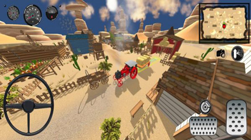2、沿箭头方向,驾驶汽车穿过小镇,经过教堂、木屋等建筑,按地图指引(右上角)探索荒漠区域。