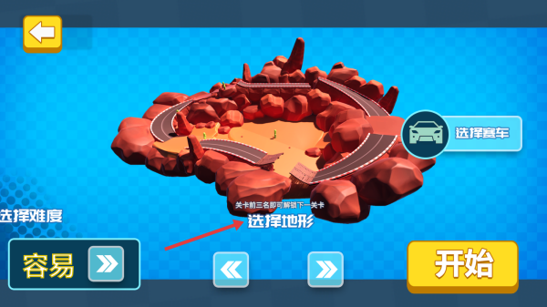 2、选择难度(如【容易】),点击【选择地形】确定赛道,再选赛车,点【开始】开启比赛。
