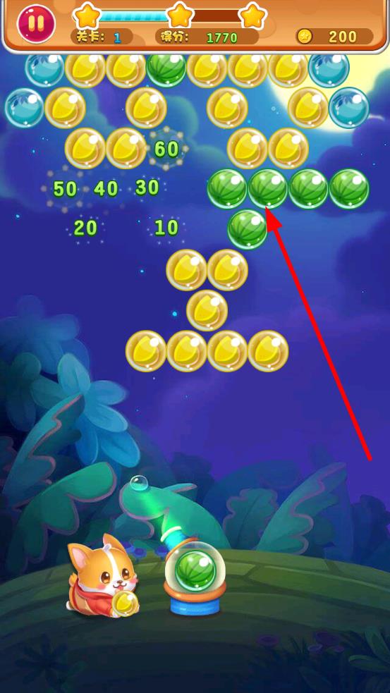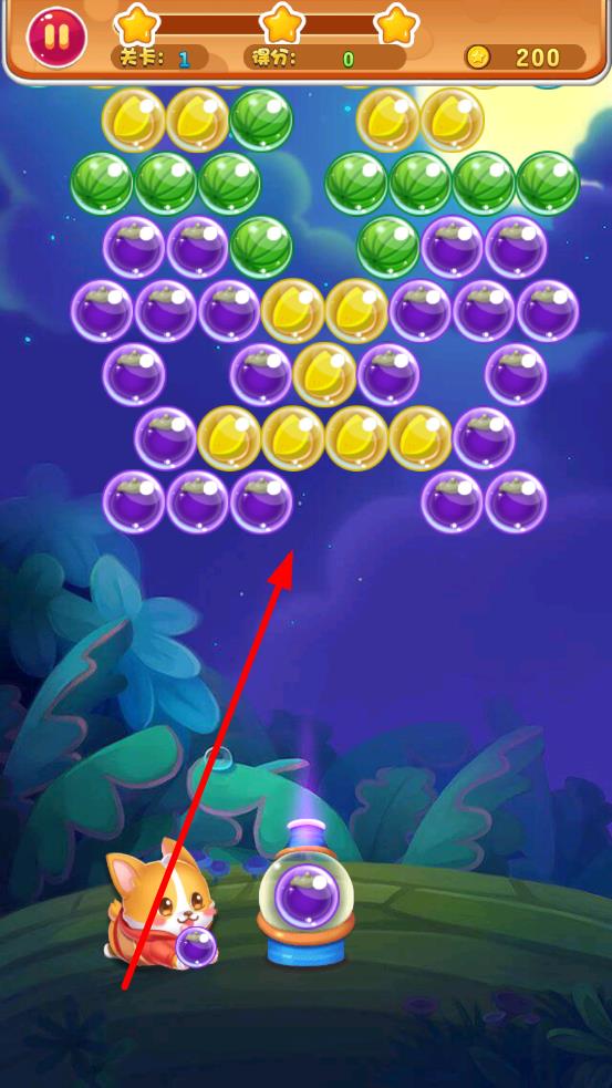 2、策略消除方法:留意泡泡群中的悬挂泡泡,消除其下方的支撑泡泡可让整串泡泡掉落,实现大面积消除,节省发射次数,提高通关效率。