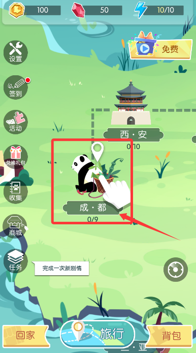 1、启动游戏后,在地图界面选择"成都"目的地开始探索。