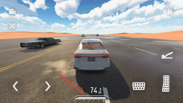 2、进入沙漠公路场景,依据车速【74.2】等数据,操控车辆躲避其他汽车,在道路上稳定行驶。