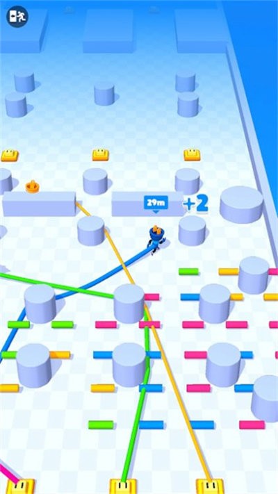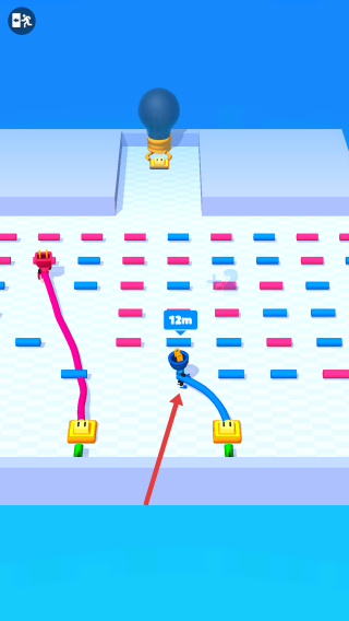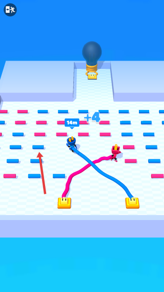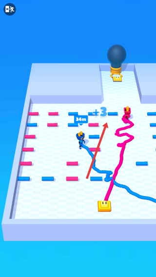 1、操控蓝色角色(或粉色角色)在棋盘格场景移动,沿同色方块连线,收集“+3”“+4”等数值,增长移动距离(如12m→14m)。