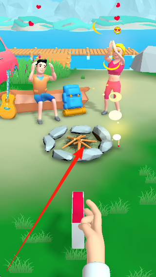 1、通过点击来搭建篝火,在篝火搭建完成后拿出火柴对篝火进行投掷,使火柴点燃篝火,即可开始露营。