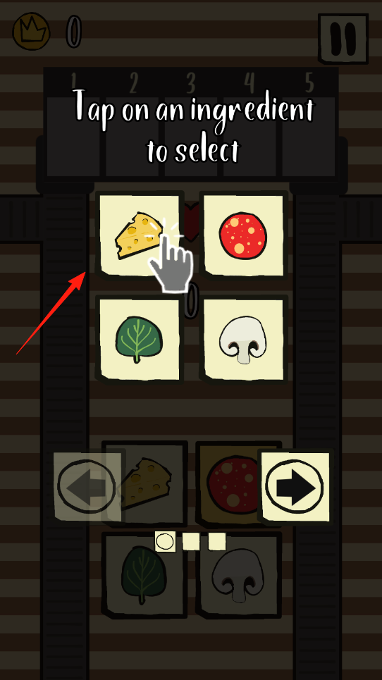 1、进入游戏后在食材界面,根据提示“Taponaningredienttoselect”,点击箭头指向的奶酪等食材,为制作披萨备料。