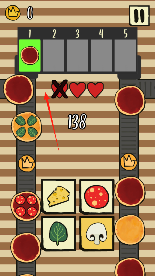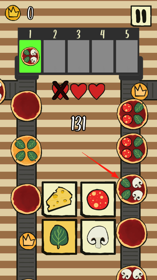2、进入制作场景,观察传送带上的披萨订单(箭头指向),订单显示需添加的食材,快速选取对应食材。