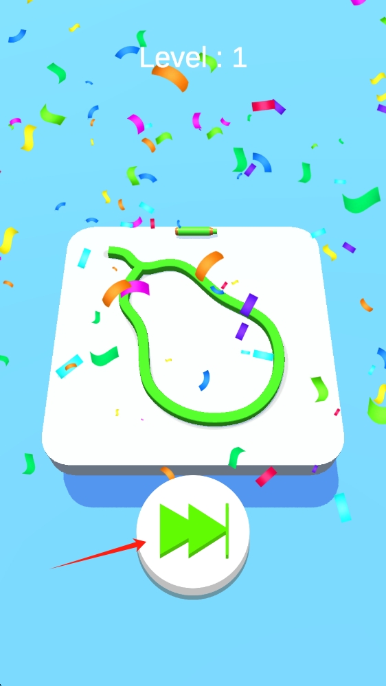 3、关卡 1 完成画面,绿色轨迹绘满,有彩纸特效、下一关按钮,点击进入下一关。