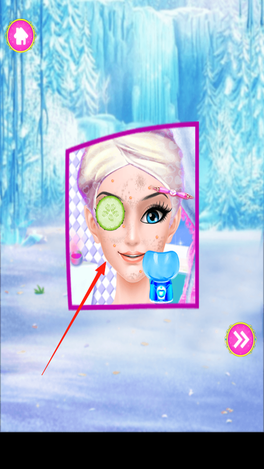 2、进入脸部护理场景,看到公主脸上有小状况,按照指引,用黄瓜片等道具护理脸部,点击对应区域,给公主敷黄瓜、补水,一步步改善肌肤状态,体验美妆流程里的基础护理步骤。