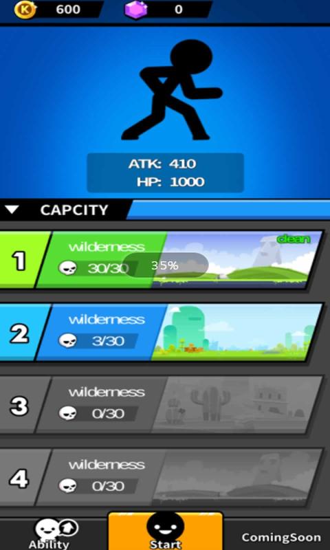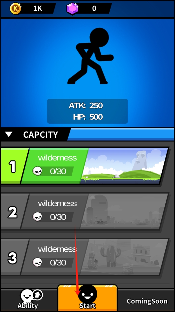 1、火柴人角色界面,显示【ATK:250】【HP:500】,有金币(1K )、紫晶(0 ),点击开始游戏。