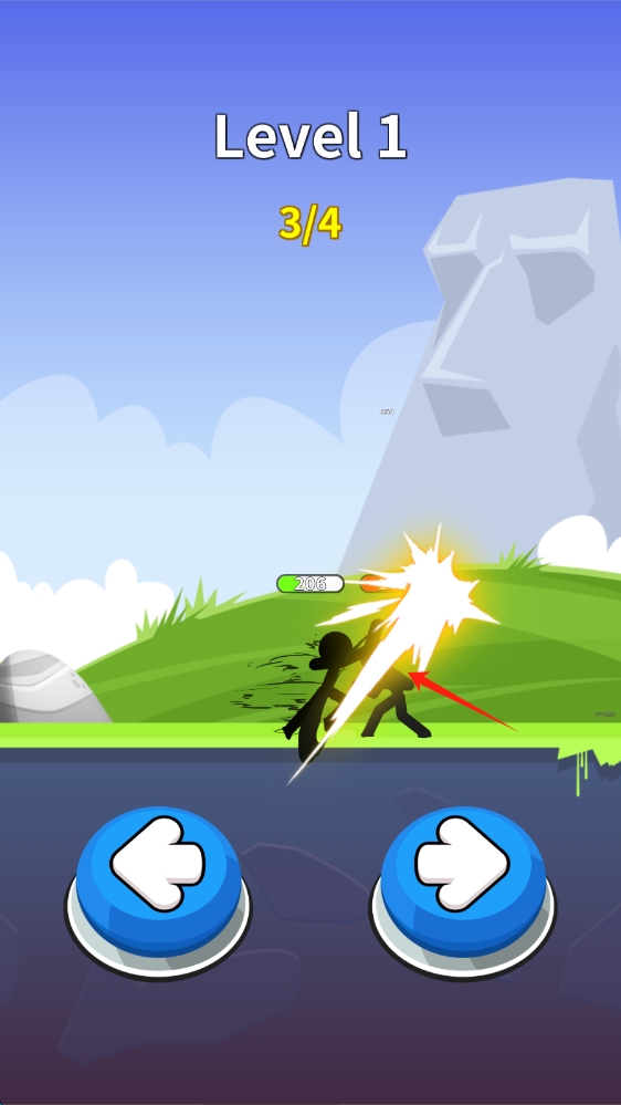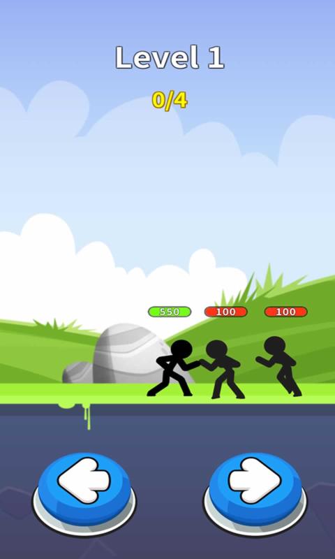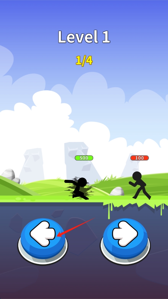 2、游戏【Level 1】(关卡 1 )战斗画面,火柴人对战,有左右移动按钮,点击移动人物 。
