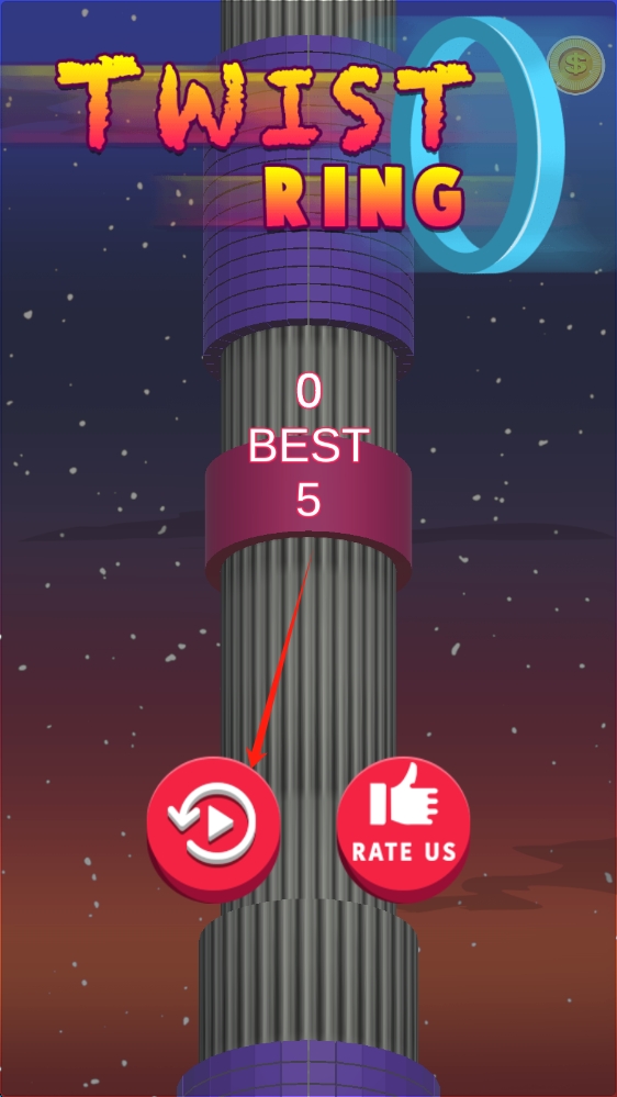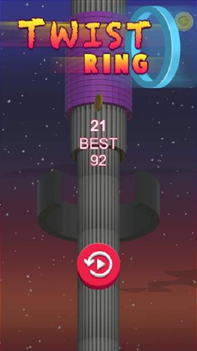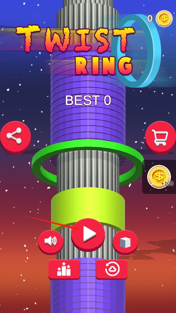 1、游戏名称【Twist Ring】,显示 “BEST 0”,有分享、购物车等功能按钮,点击开始游戏。
