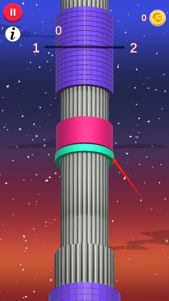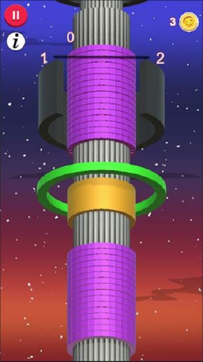 2、游戏关卡画面,彩色圆环需精准套入立柱对应位置,界面有暂停、按住缩圈。