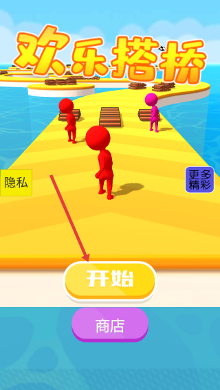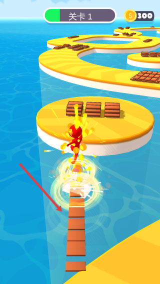 1、点击“开始”进入关卡1,操控红色小人在黄色跑道奔跑,沿途收集木板。