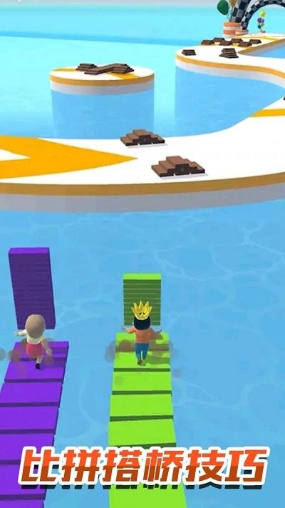 1、搭建桥梁快人一步:通过收集砖块、木板或甲板并堆成一堆,然后建造桥梁走捷径,这种方式能让你比其他竞争对手跑得更快,从而赢得比赛,考验策略与操作的结合。
