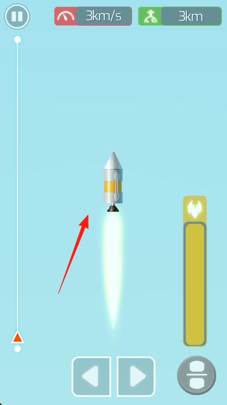 3、火箭发射后,关注速度(3km/s)、高度(3km)显示,可通过底部按钮调整飞行状态,让火箭顺利升空,完成任务。