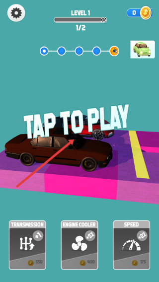 1、关卡1,点击“TAP TO PLAY”开始,操控棕色赛车在彩色跑道行驶,与其他车辆竞速。