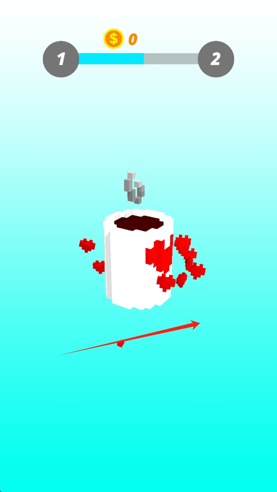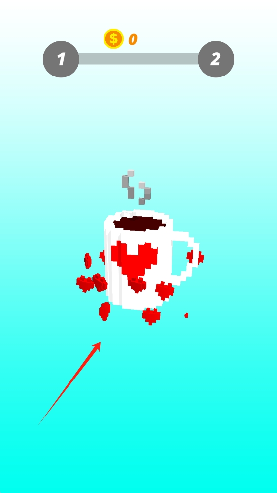 1、像素风格的咖啡杯,上方有进度(1→2 )、金币(0 ),呈现被击碎的红色心形碎片效果,滑动开始游戏。