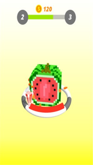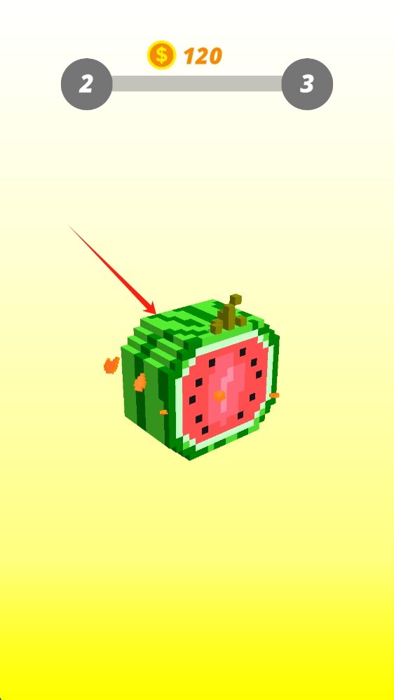 3、像素西瓜,进度(2→3 ),金币变为 120 ,显示被击碎的橙色碎片,延续击碎玩法,点击查看。