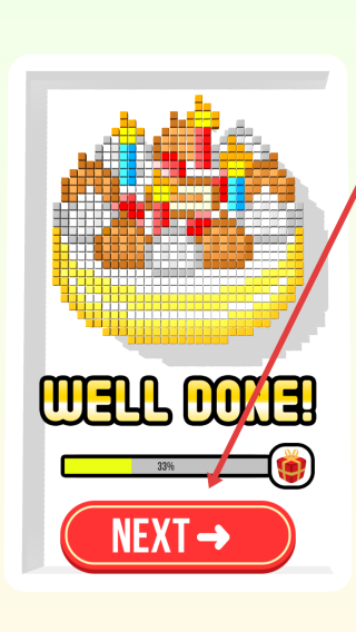 3、成功拼装(WELL-DONE!)后,可以点击【NEXT】,进入下一关卡,挑战更复杂彩珠模型,解锁新图案。