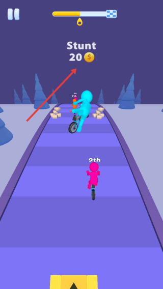 3、赛道上超越粉色对手,收集“Stunt20”金币,完成竞速,争取更好排名。