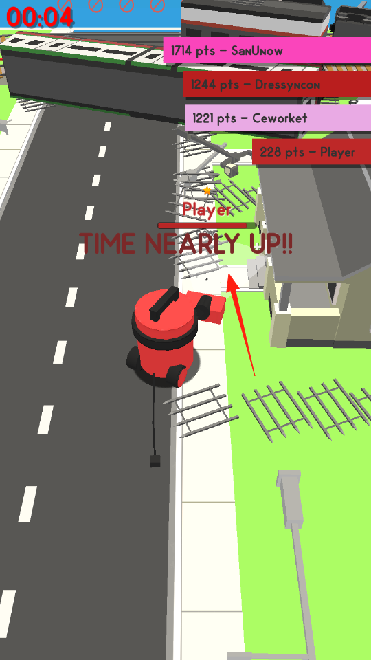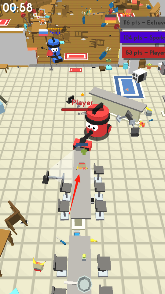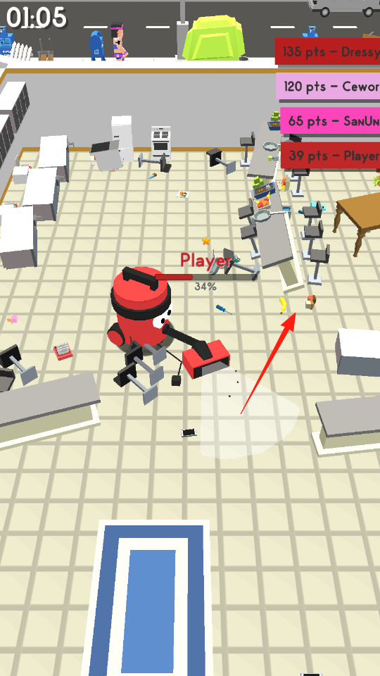 2、在场景中,留意其他吸尘器(如蓝色),避免碰撞,同时高效清理垃圾,提升积分排名(右侧显示分数)。