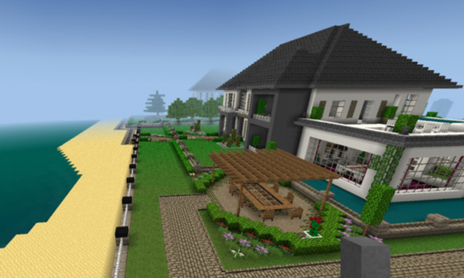 3、通过十字键移动角色,绕现代房屋行走,查看建筑细节,可尝试互动建造,或利用飞行模式切换,从空中视角规划房屋建造。