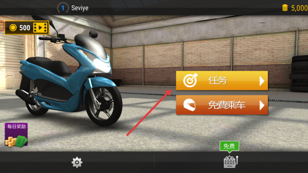 1、车库界面选蓝色摩托,点击【任务】按钮,进入任务列表,准备开启骑行挑战。