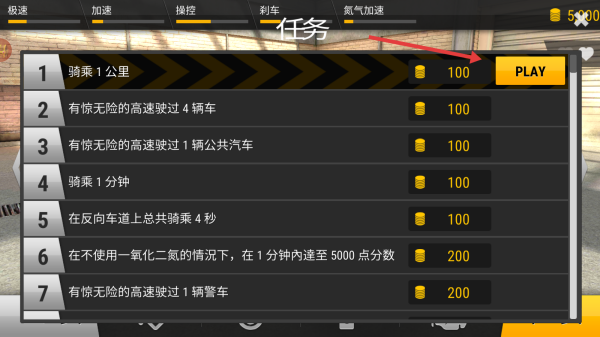 2、任务页选“骑乘1公里”任务,点【PLAY】,驾驶摩托在城市道路开始骑行。