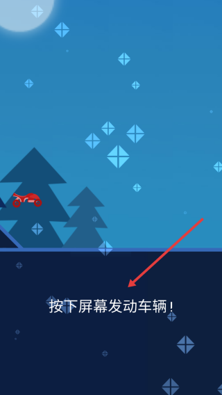 2、进入雪地场景,按屏幕发动红色摩托,准备在含树木、雪花的赛道行驶 。
