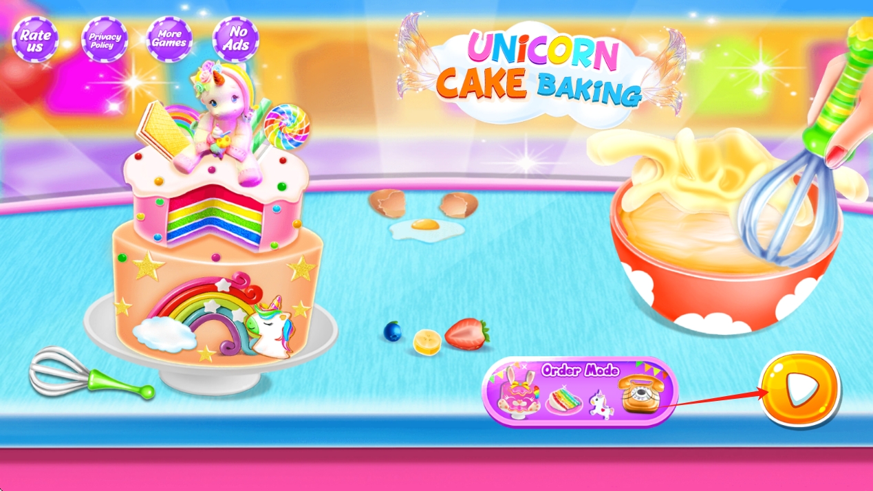 1、游戏标题界面,展示烘焙好的独角兽主题蛋糕,有 “Rate us”(评分 )、“Privacy Policy”(隐私政策 )等按钮,点击开始游戏。