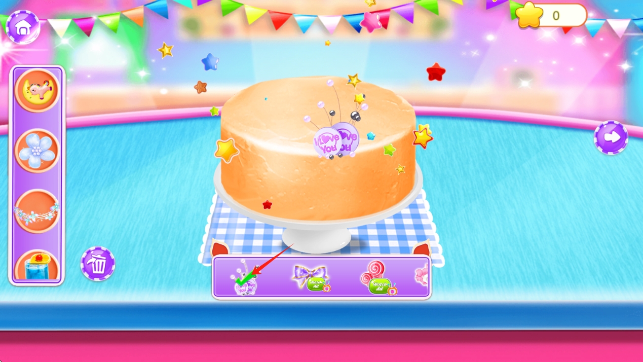 2、蛋糕装饰环节,显示已涂抹奶油的蛋糕,左侧有装饰素材(独角兽、花朵等 ),底部有装饰选项,点击使用道具。
