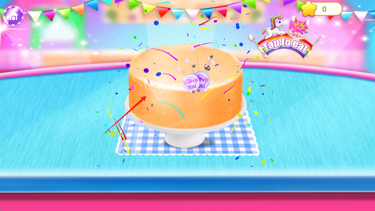 3、装饰完成画面,蛋糕呈现最终效果,有 “Tap to eat”(点击食用 )提示,洒落彩带营造庆祝氛围,点击查看。