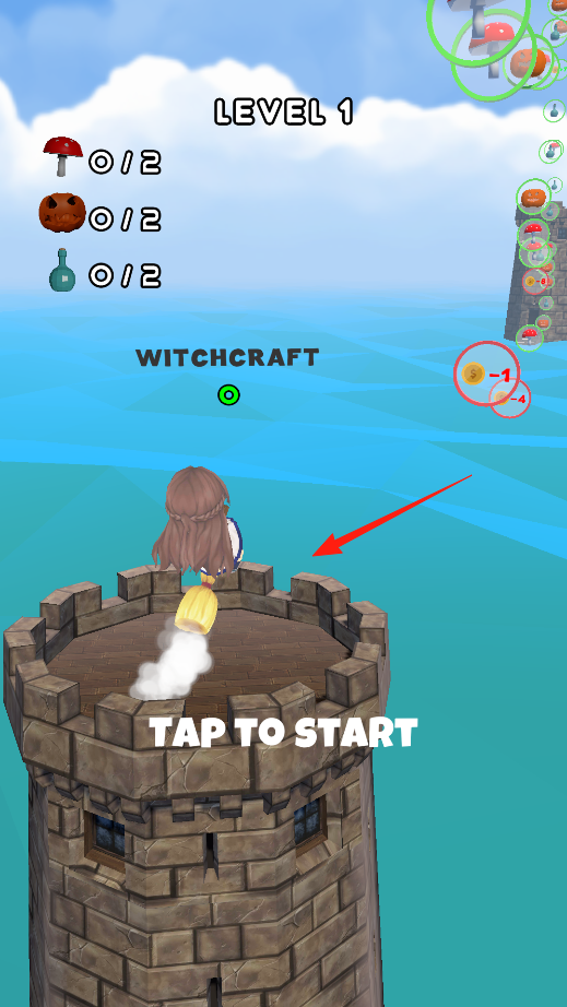 1、进入魔法酷飞第一关,显示要收集蘑菇、南瓜、瓶子各两个,点击【TAP TO START】,角色就会骑着扫帚飞出去,规划好路线,像个小女巫一样去完成收集任务。