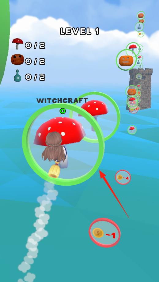 2、角色飞起来后,遇到绿色圆圈标记的区域,里面有大蘑菇,还有南瓜、瓶子藏在场景里,操控扫帚飞进这些圈,收集对应物品,同时要避开减金币的红圈。