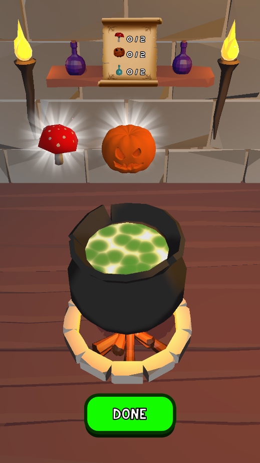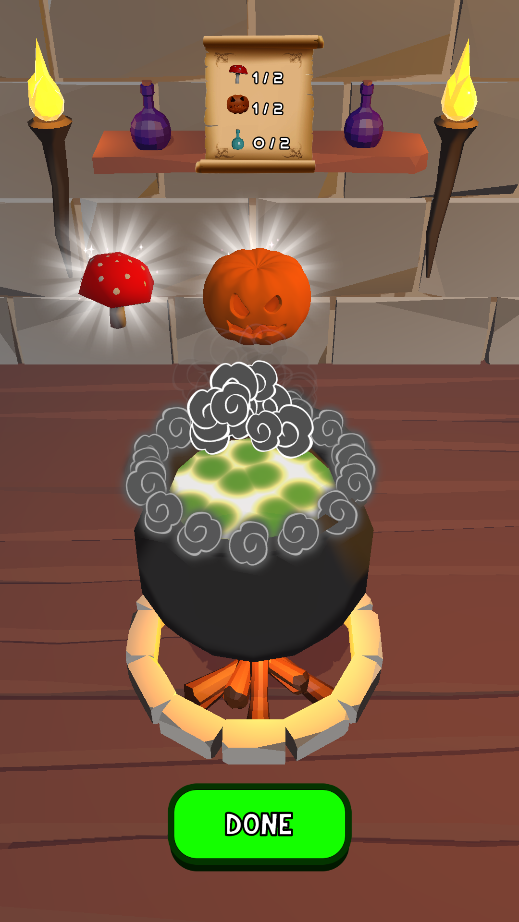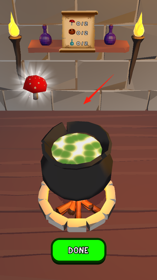 3、进入一个小屋,把蘑菇放进魔法锅,等材料都加进去,点DONE完成potion制作,看看能不能成功炼制,把收集来的东西变成魔法药剂,完成这一关的任务,继续下一关的新挑战。