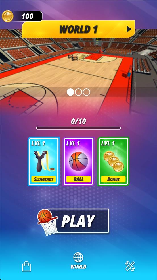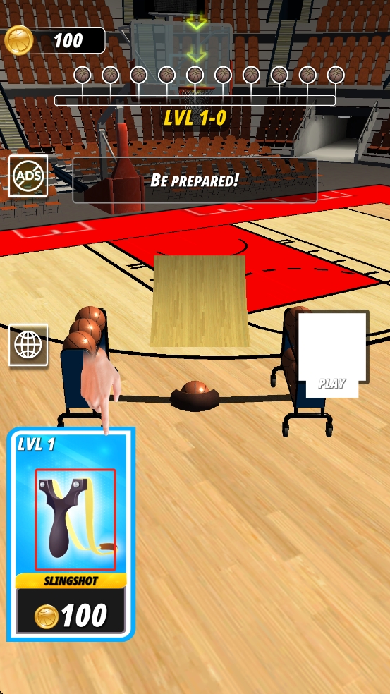1、点击“LVL1”对应的弹弓卡牌花费100金币解锁,准备阶段观察篮筐及篮球布局,长按弹弓调整发射角度与力度,瞄准后松手发射篮球。