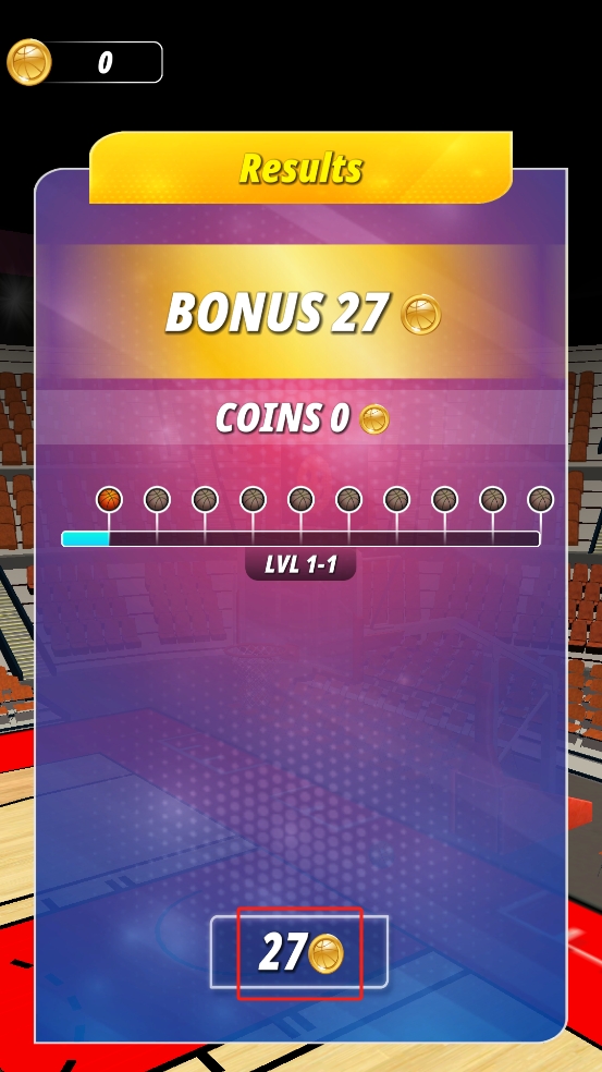 3、关卡结束显示“Results”,获得27金币奖励,点击下方带金币的按钮领取,积累金币可解锁更高等级弹弓或道具。