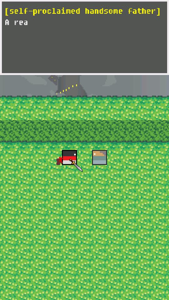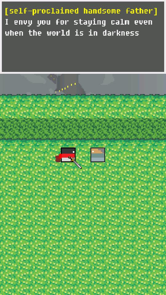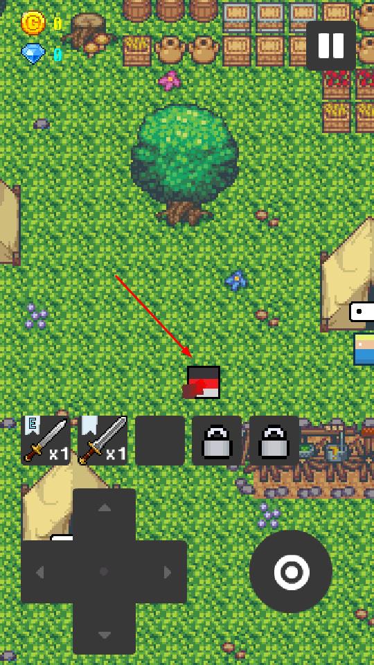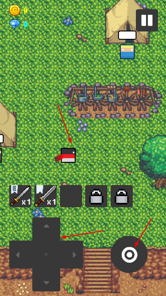 1、进入游戏界面,操控下方十字按键移动角色,在草地场景探索,靠近目标物体(如红黑方块)触发互动。