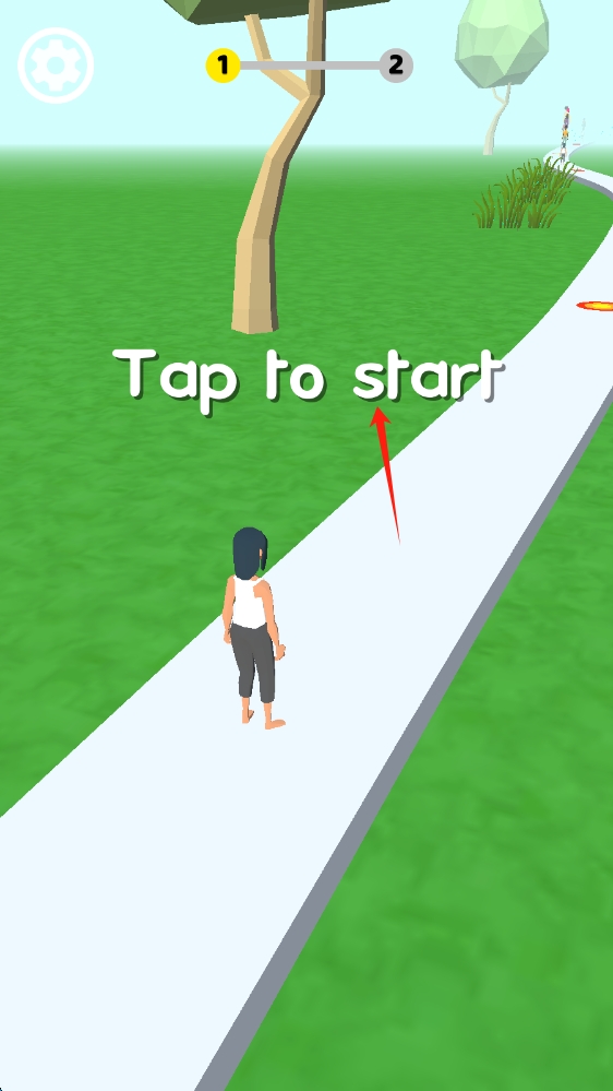 1、游戏开始界面,角色站在道路起点,“Tap to start”(点击开始 )提示,背景有树木、进度条(1→2 ),点击开始游戏。