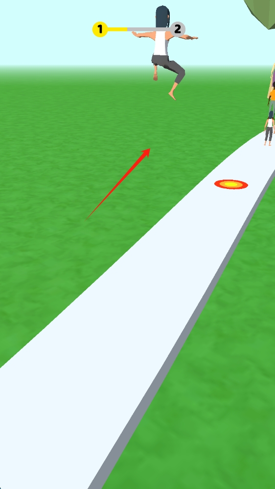 2、游戏进行中,角色跳跃跨越道路障碍,进度条显示 “1→2”,点击屏幕跳跃。