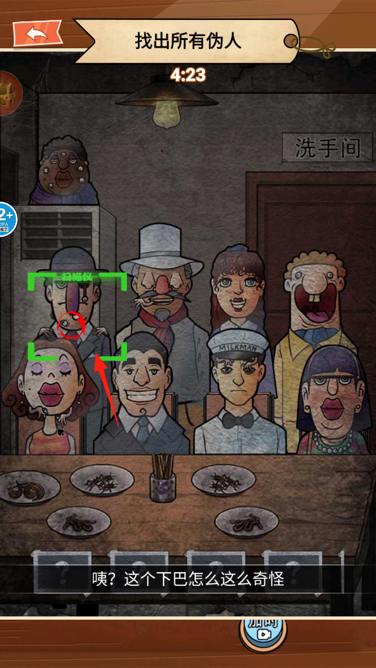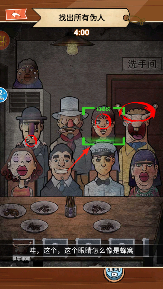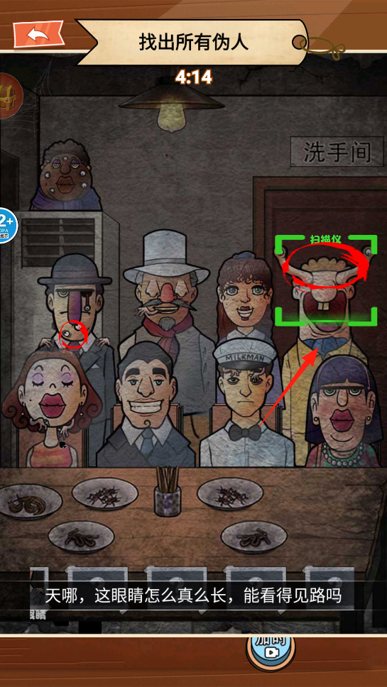 2、继续挑战,盯着角色们的模样瞧,用扫描仪看到有超长眼睛的角色,这就像玩大家来找茬升级版,把伪人一个个揪出来,感受在人群里识破伪装的成就感。