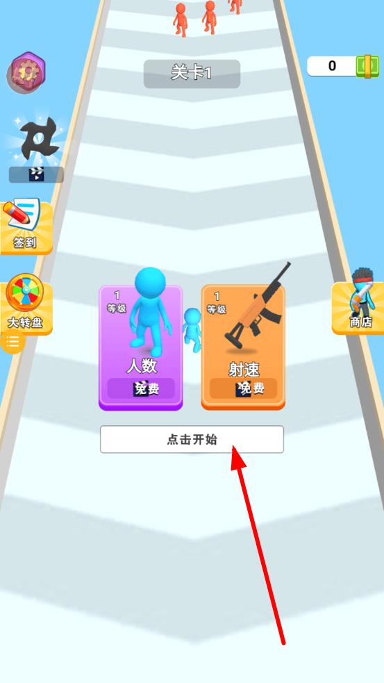 1、在关卡准备界面,可点击“人数”“射速”免费增益提升初始战力,也能利用左侧签到、大转盘等功能领福利,点击“点击开始”正式开启闯关。